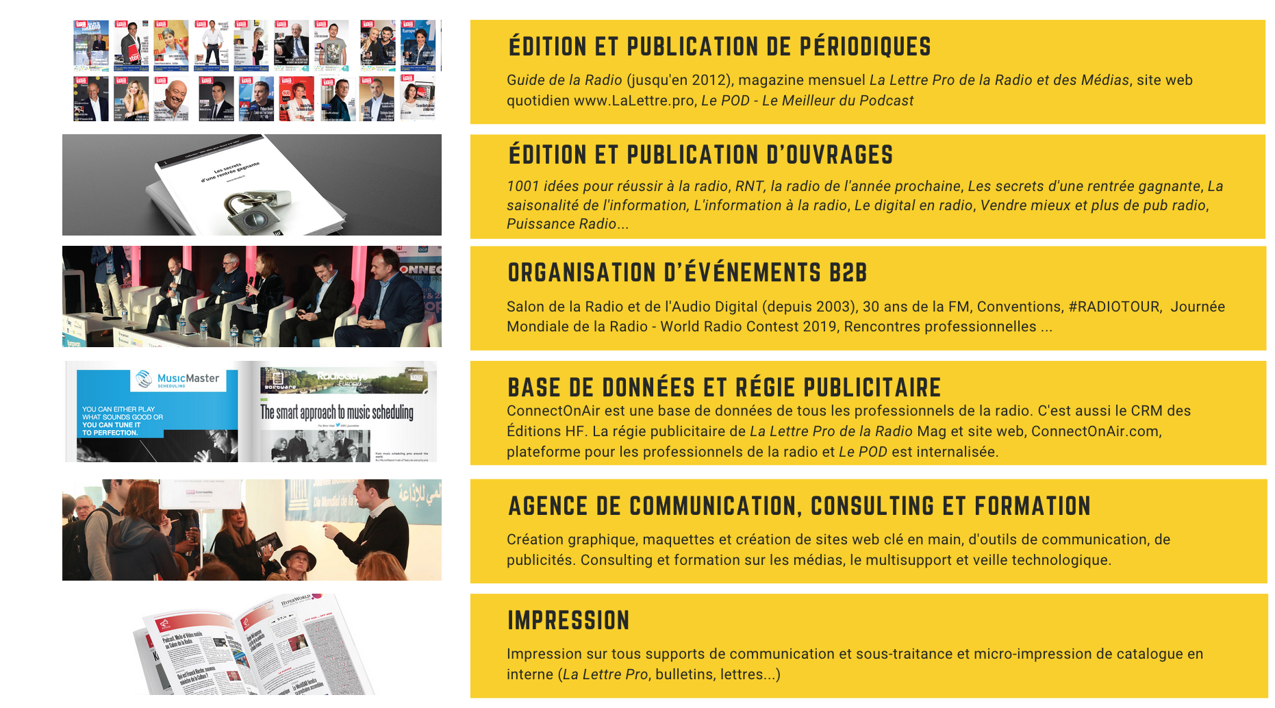 Éditions HF réalise également du consulting pour de nombreuses sociétés de l’audiovisuel. Éditions HF est une société à responsabilité limitée de presse créée en 2001 par Philippe Chapot, fils de Maurice Chapot, qui a dédié sa vie au monde de l’audiovisuel et reconnu dans le monde de la télévision et la radio.